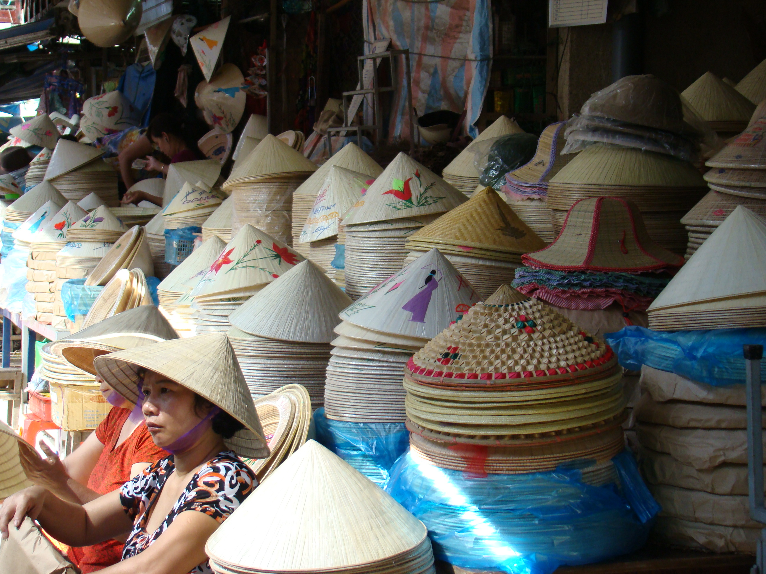 Kraam met hoedjes op markt in Hue